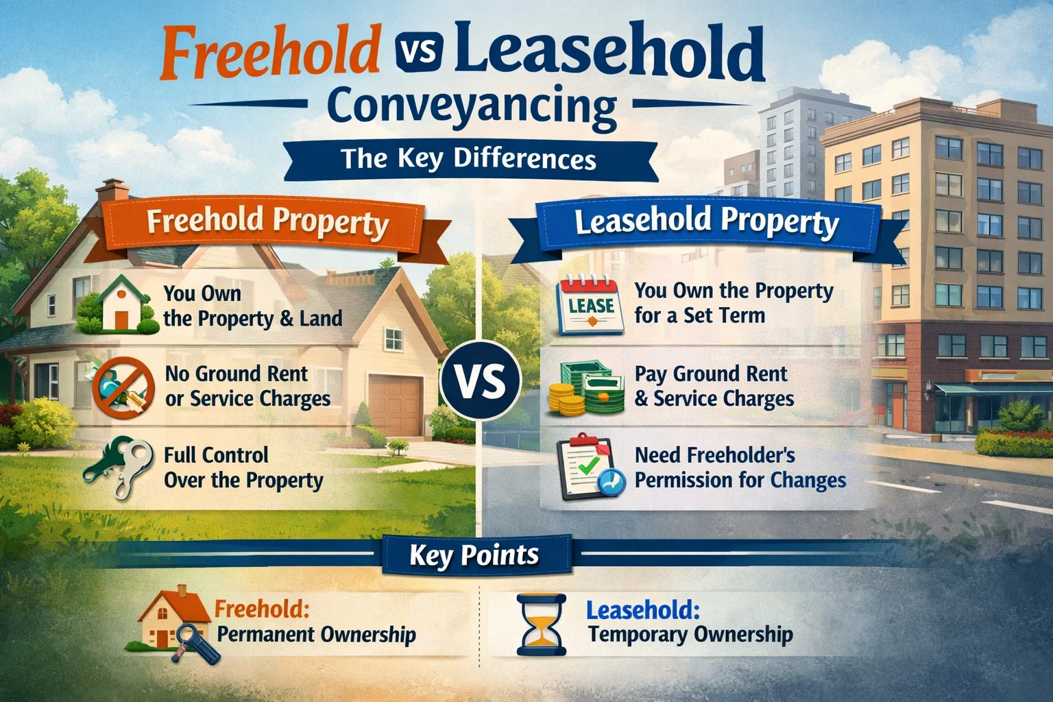 Freehold and leasehold conveyancing differ in complexity, cost, and timescales. While freehold transactions are generally simpler and quicker, leasehold purchases involve additional legal work and ongoing responsibilities.